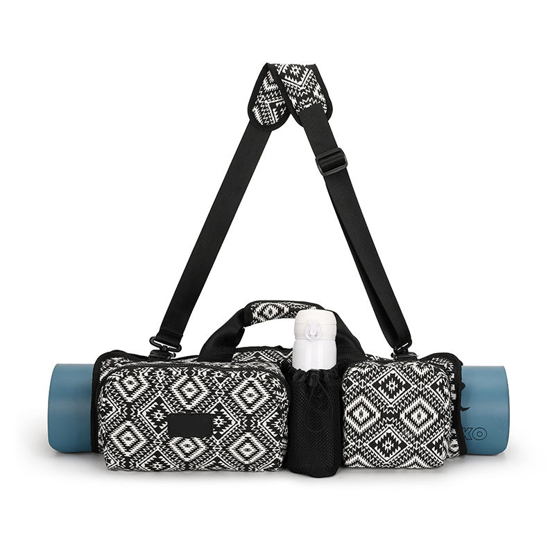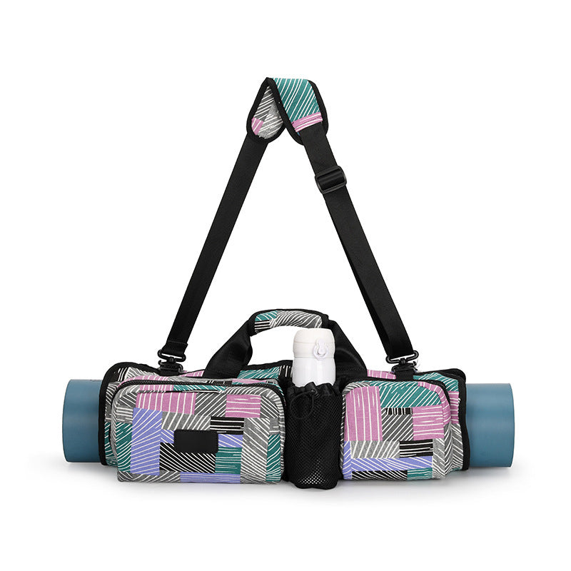 6 Zones to Utilize: Different compartments for different purpose to get organize. 2 front pockets that stores Yoga Blocks or Shoes or other essentials. Mesh pocket to keep a water bottle. Large center zippered pocket to keep a towel + extra clothing. Center zone to keep a rolled yoga mat. Back pocket to hold your keys + cellphone + wallet.