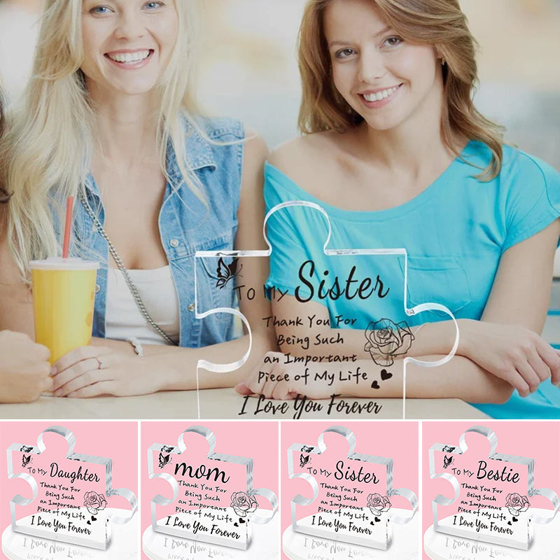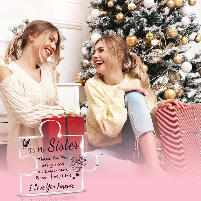 • Beyond its sentimental value, this engraved puzzle acrylic plaque serves as a versatile decorative item. It can be proudly displayed on a desk, shelf, or living room, etc, radiating sisterly affection and adding a touch of warmth to a sister's room.