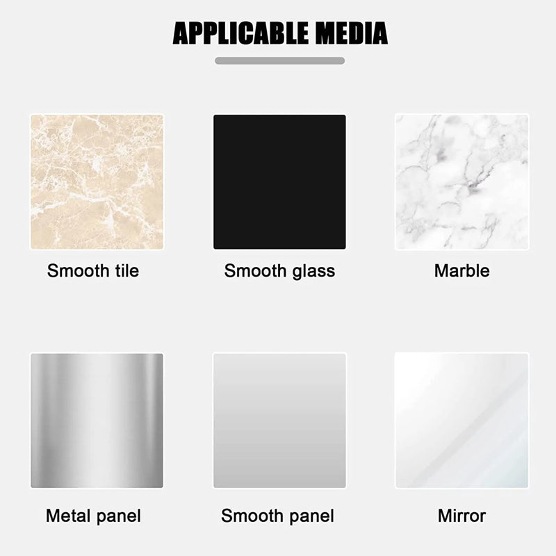 - Suitable for various surfaces, glass, tiles, marble, metal, painted wood, and even textured surfaces, such as frosted glass.