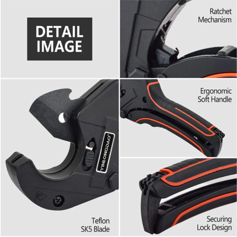 PVC tubing cutter adopts ratchet drive technology and arch angle design to greatly save your strength.the spring-loaded handles and powerful bite force improve work efficiency by fast cutting.