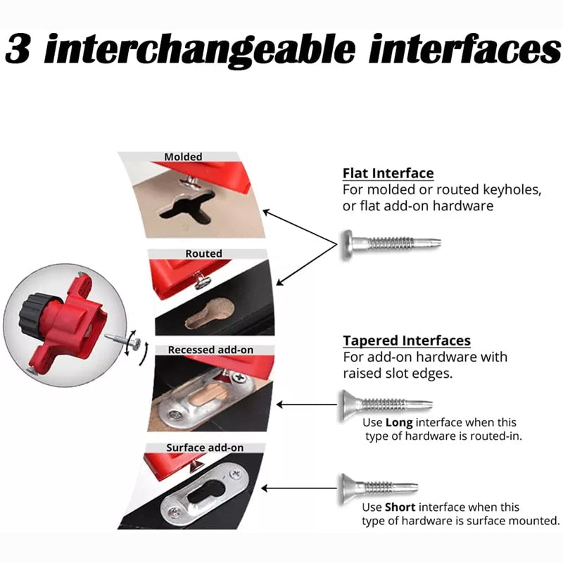 WORKS WITH THE MAJORITY OF KEYHOLE SLOT STYLES - Using the included interfaces, works on all keyhole slot materials and most keyhole slot configurations, including molded-in (plastic), cut-in (wood, plastic or metal), add-on hardware (surface mounted or recessed). Accommodates thicknesses ranging from thin metal to 3/8".