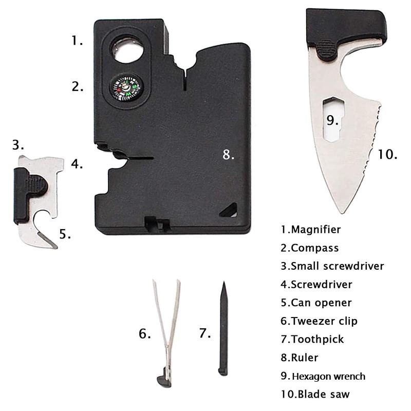 - 10 kinds of daily function: a serrated nife, bottle opener, a compass, a magnifying glass, scale, small slotted screwdriver, big slotted screwdriver, tweezer, small toothpick, outer hexagon wrench.