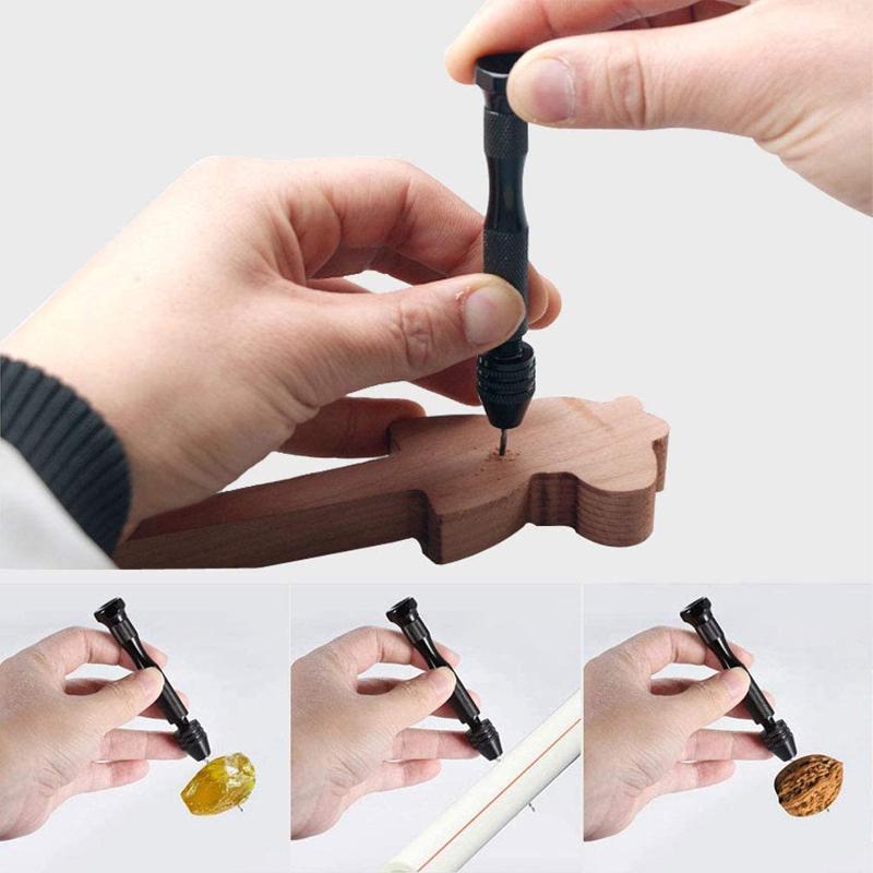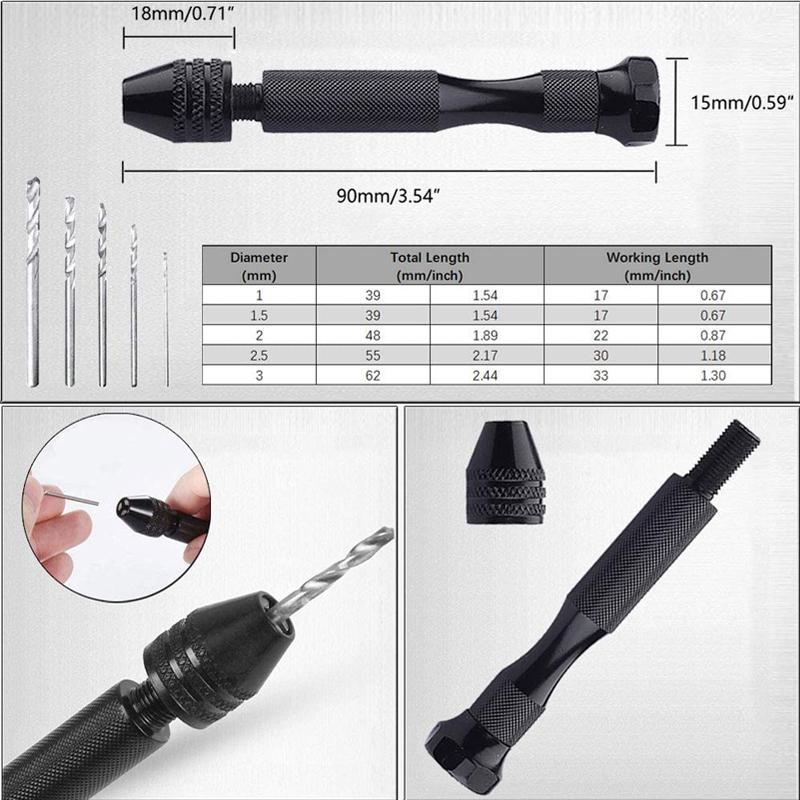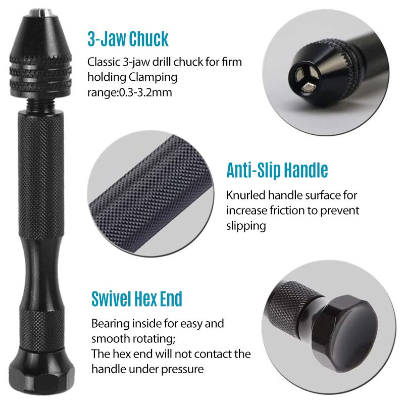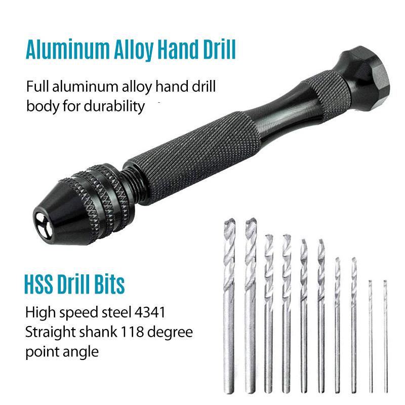 MATERIAL - Pin vise and chuck are made of aluminum alloy; Twist drill bits are made of high speed steel 4341; The knurled handle and hex shaped swivel end is designed for comfort and grip. Swivel end for easy manual drilling.