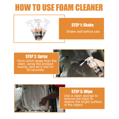 Foam Cleaner Simple to Use: Immediate Results: Just directly spray cleaner on the desired area. No rinsing is required. Just wipe away foam with a towel after cleaning.